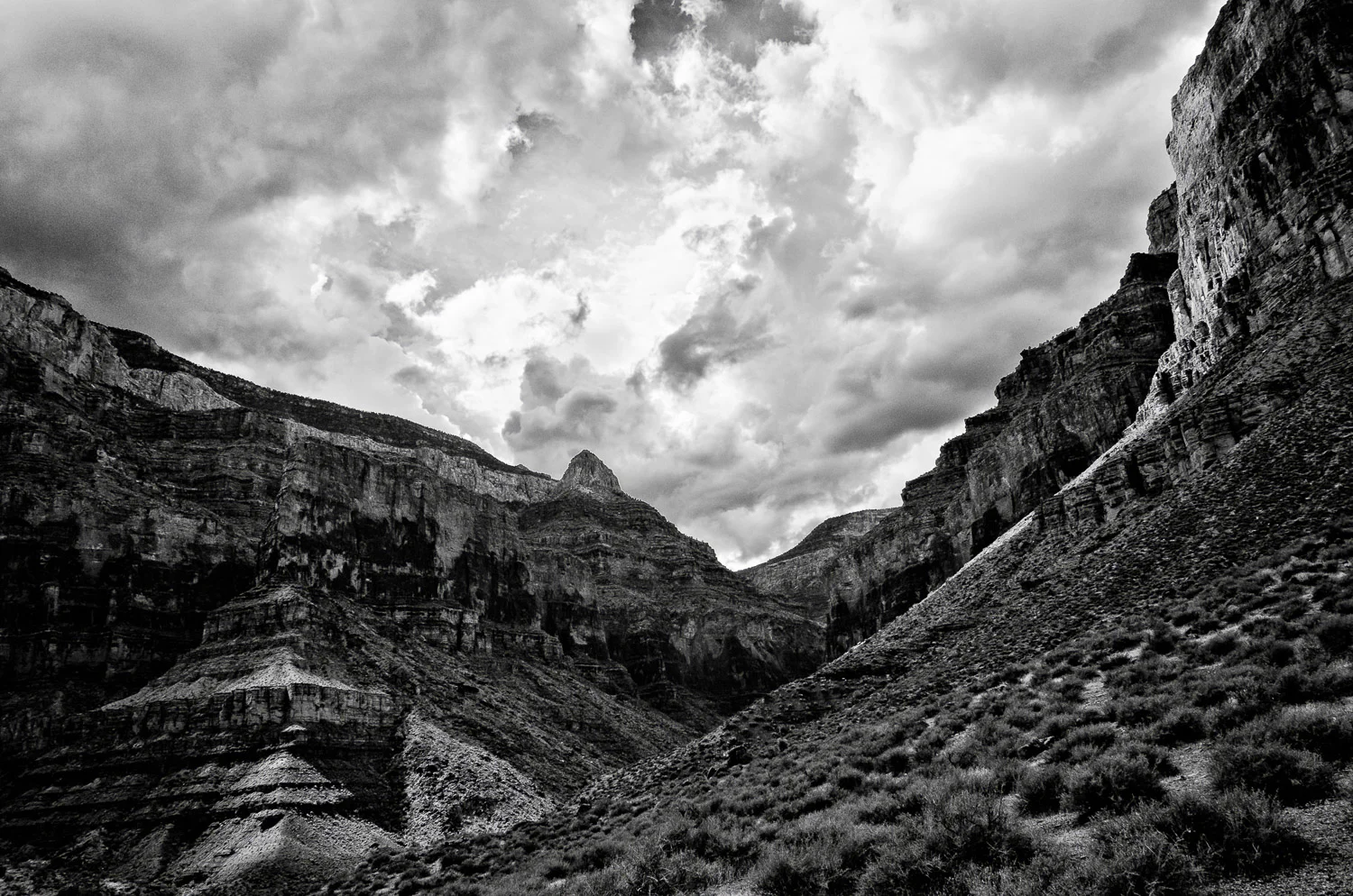 The sky turned from gray to almost black. Thunder rolled around the canyon as if it were the sound of a gargantuan boulder on the loose. Behind it came terrible bolts of lightning and then curtains and curtains of rain. The roads and gullies flash flooded and turned to muddy rivers. All this was happening on the gentle rim in the park's developed village. I imagined what it was like down there, down deep into the canyon itself. Soon I'd be there with nothing but a poncho to protect me. My futile hope was that it would all blow through and the morning would greet us with sunshine and chirping birds. But, deep inside I knew better. Monsoon season isn't like that.