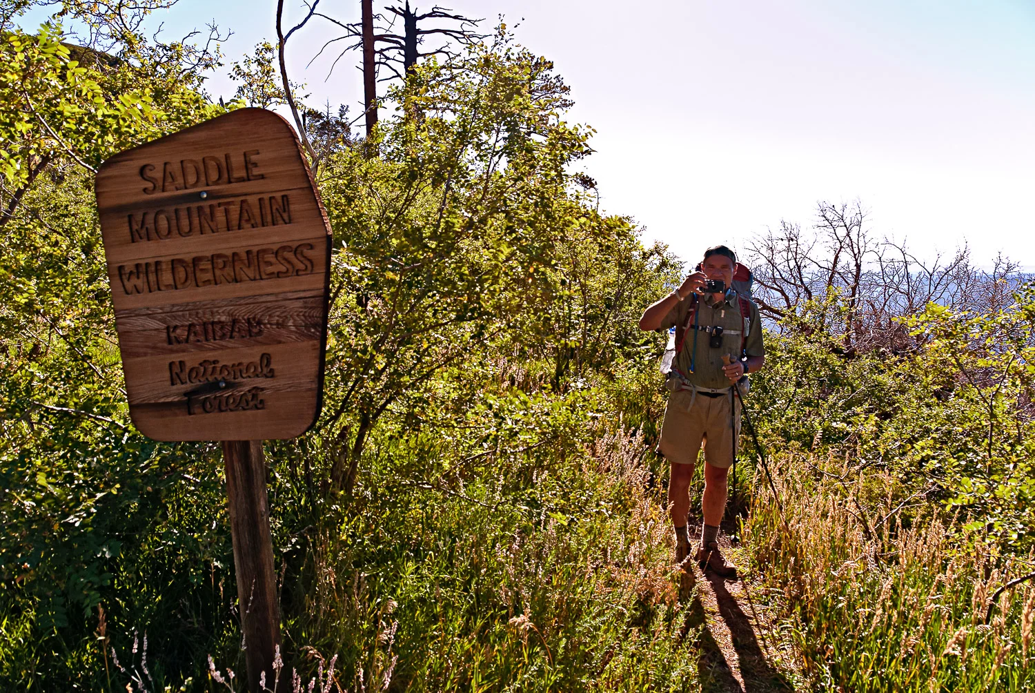 It didn’t take long before Nankoweap played its tricks. The genuine Nankoweap, the real deal, started when we saw the sign welcoming us to Grand Canyon National Park. That took awhile to reach. Before that the path was a national forest trail, officially called Saddle Mountain Trail 57. This preliminary trail was a rigorous romp in an alpine forest studded with aspen. It offered a compelling vista of much of Northern Arizona from an elevation of over 8000 feet. Saddle Mountain Trail 57 was lovely and dramatic—but everything before Nankoweap was foreplay.