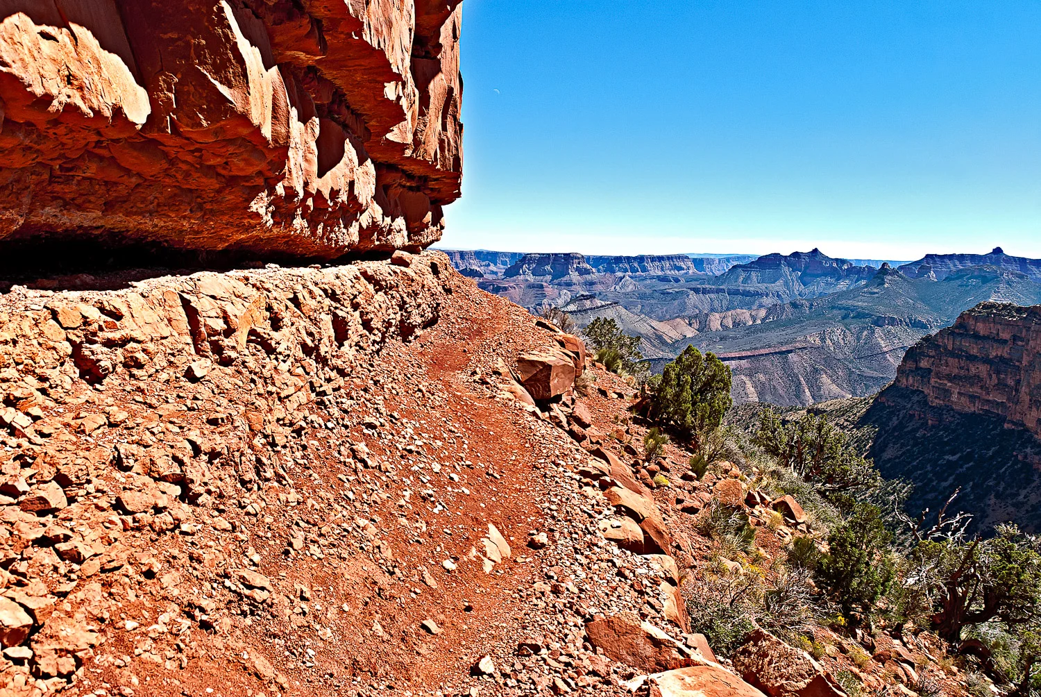 The steep and craggy descent soon settled onto a great ledge of red rock called the Supai Group. This formation has eroded unevenly and is advantageous for trailblazing because of its many shelves and ledges. You can hike along the Supai Group on many trails in the canyon—but nothing quite like this. The trail in front of me was red gravel that was loose and crumbly. It was about a foot wide, slanting downward towards the edge. It was so faint that I could only see it for about a hundred feet. Then it blended into the drama of the cliff. The only way to hike was to put one careful foot in front of the other. Focus was now equaled survival.