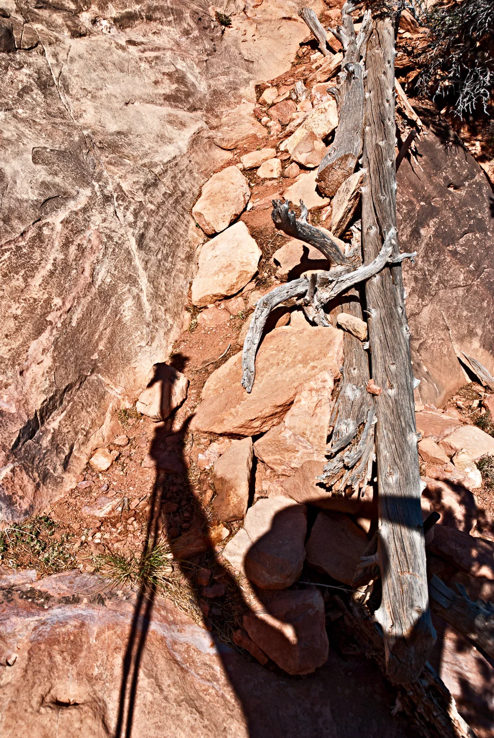 We were already on Nankoweap when we reached the trailhead bulletin board. But the bulletin board was a last-chance warning. After that we headed right over the rim. Things then got interesting. It was steep and rocky, more a controlled slide than a hike. As we skidded down I heard myself ask aloud, "How the hell am I going to get back up this thing?" Soon we slid down to a gray log that has been laid into the outside edge of the trail. To our wonder, it was propping it up and holding back loose rock. This dead, old tree was the only thing keeping the rocks, the trail—and everyone on it—from tumbling down off the edge. That edge went over and down about 1000 feet. I learned, at that moment, to look straight ahead at the meager trail for most of the hike. Looking over the edge was not an option.