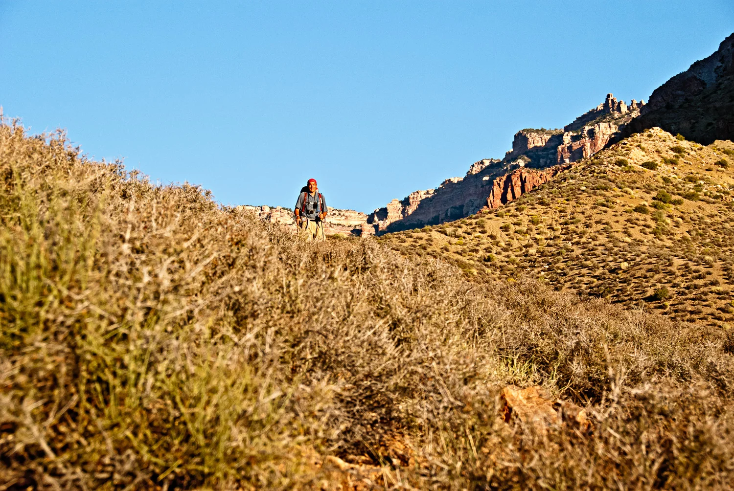 The edge of Nankoweap was coming to an end. We'd hiked along the red-rock traverse until there was no more of it. We were at the end of the side canyon. The only way to go was up a short distance and then out of the canyon. Nankoweap was tenacious and its last grip was filled with boulders and gravel and gnarly brush. But, a final surge out of the canyon is always aided with a healthy dose of adrenaline. Soon we were released from the canyon and its grip.